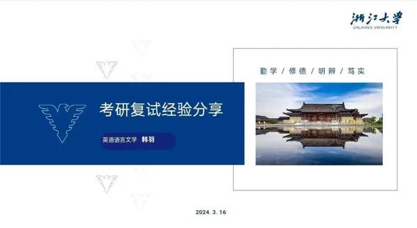 来自浙江大学英语语言文学专业2022级的韩羽为在座同学带来了英语语言文学专业复试的经验分享。她提到,浙江大学的复试流程大致分为自我介绍、语言学知识问答、文学知识问答和结构性问答四个环节,每一个环节都需仔细打磨。她指出,在最开始的自我介绍部分应当有意识地安排内容,展现自身优势,同时为后续的问答提供话题点;当遇到自己不熟悉的问题时要稳定心态,运用熟悉的知识应对开放式问题;对于面试中的超纲问题,要避免不懂装懂,针对结构性问答,应事先准备好个人回答框架等。最后,韩羽提醒在座同学,要尽早着手准备复试,熟悉用英语交流的方式,放松心态、自然表现。