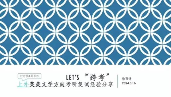 就读于上海外国语大学英语语言文学专业2023级的徐雨诗分享了自英语(师范)跨考至英美文学方向的经验。徐雨诗提到,上海外国语大学的复试分为线下笔试和全英文面试两部分,其中,面试占比更大,宏观倾向于对人文情怀和文学性的考察。对于同学们的疑问,徐雨诗解答道,英美文学考研主要需要准备英美文学史和时代背景、重点作家、重点作品和文学理论术语的相关知识。她强调,要找到自己的兴趣点,围绕相关知识积累素材,并保持一定的阅读与思考。徐雨诗指出,考研复试时间紧、任务重,准备时须有针对性,抓大放小;要善用圣才、星火等辅导书,用英文梳理内化,定期复习。她鼓励在座同学,要在有限时间内做能做的,不要对劳逸结合有负罪感,要在保有诚恳认真的态度的同时,放平心态。