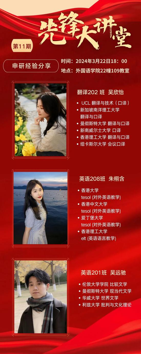 3月22日晚,浙江师范大学外国语学院第11期先锋大讲堂暨申研经验分享会在外国语学院22幢109教室顺利举行。本次讲座采取线上线下相结合的形式进行,由学工办娄瑶琪老师主持,彭银银老师以及吴远驰、朱栩含、吴欣怡三位学长学姐向大家分享他们申研过程中的方法与经验。