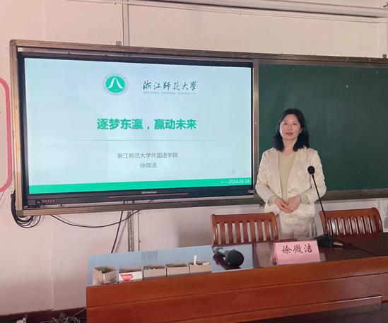 首先由徐微洁教授为该校师生作了“逐梦东瀛、赢动未来”的主题讲座。徐教授围绕为何出国留学、如何出国留学、如何考取国外大学、留学费用如何、如何在日生活等五个方面为建华中学师生进行了详尽的讲解。