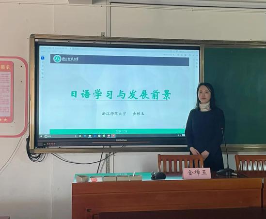 紧接着,金稀玉副教授以“日语学习与发展前景”为题为建华中学师生进行讲学指导。讲座内容紧紧围绕高考日语、大学日语、专业学习、就业前景等主题进行。