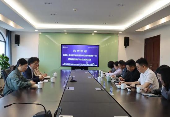 调研组的最后一站来到义乌市北苑中学,该校陈建新校长为调研组介绍了学校的历史和基本情况,聚焦“方·圆”讲述了学校着力打造的特色项目,表达了对浙师大外国语学院的信任。随后,调研组与陈校长就实习基地建设等开展了交流。