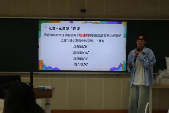 在这一环节中,各个小组进行纠音展示。主讲人邀请一名学员进行口语展示后,邀请第二位学员进行展示,以纠正前一名学员的错误之处。随后的角色扮演活动中,两名学员进行对话,在日常用语中感受连读现象。