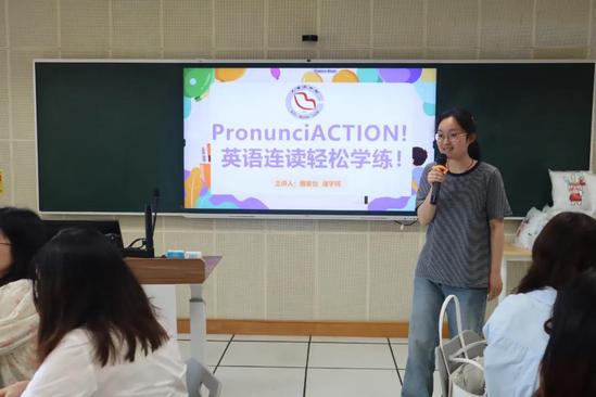 本次活动由魏馨怡、潘宇珂主持。知识讲解分为三个部分:辅元连读、辅辅连读、其他类型。在初步讲解了意群的概念后,为了使学员更加形象地区分这几个部分,主讲人不仅展示了各类短语、句子,更辅以嘴型以及知识点总结,帮助学员学习语音技巧。