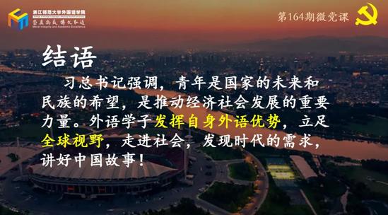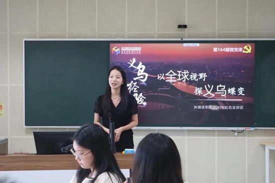 来自翻译本科生党支部的孙一琛为在座师生带来了外国语学院第164期微型党课,主题为以全球视野,探义乌蝶变。以SHINING宣讲视频为引,孙一琛围绕初心探源、交流感悟、翻译创作、携手启程四个部分展开深入讲解,以游龙古窖为例,深挖人文底蕴,探寻文化价值,在为师生呈现充满乡土气息的“文化名片”的同时,注入时代活力,展现出乡村振兴新图景。