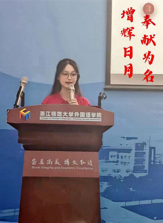 2021级学科教学英语研究生张玉钰在专业技能上精益求精,获得“田家炳杯”全日制教育硕士学科教学(英语)教学技能大赛国家级二等奖。目前,已顺利通过杭州某中学教师招聘考试。分享个人体会时,她表示首先要有理想信念,争做学为人师、行为世范的好老师。其次要夯实基本功,坚持练习口语和板书,不仅要对教材有独特的理解,还要广泛阅读通识类书籍。最后,要有认真谦卑的心态。每次磨课时,博采众长,在一次次慢慢地前进中获得快速的成长。