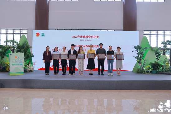 文化自信 青春挺膺担当”五四主题团日活动暨“浙师青年向山行”启动仪式。活动现场对浙江师范大学2023年度成绩突出团委、五四红旗团委、五四红旗团支部、学生社团先进团支部、优秀团干、优秀团员进行了表彰。外国语学院团委作为全校唯一单位,被授予“成绩突出团委”荣誉称号。