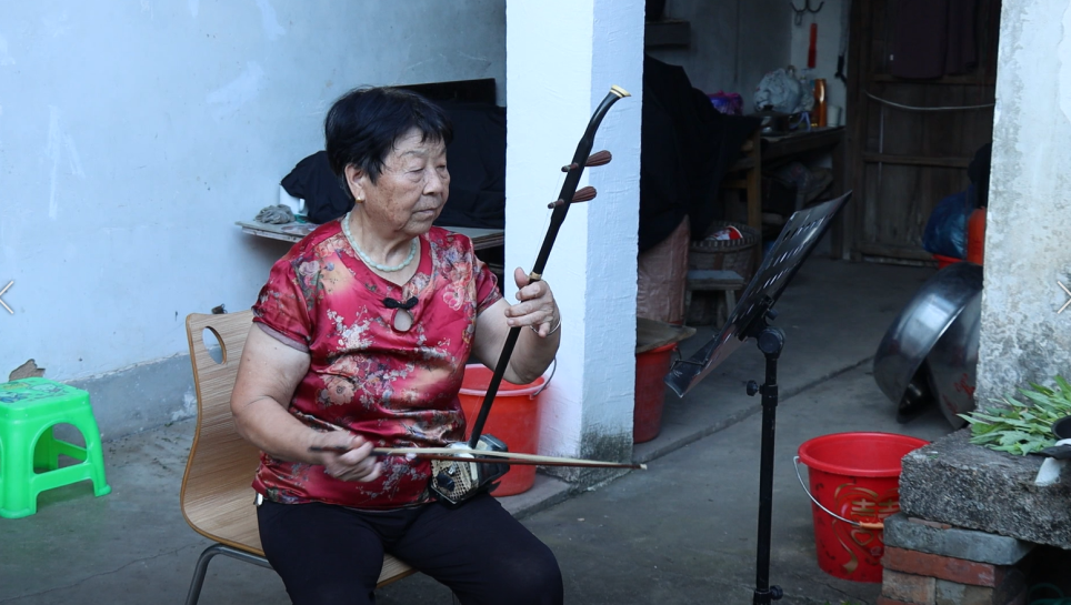 随后我们走转在缸窑村的街角巷落,一阵悠扬的二胡声飘荡在空中。我们顺着声音寻找,在一户人家门前停下了脚步,走进一看是一位名叫冯雪春的老奶奶。奶奶精气神很好,笑着招呼我们坐一会。很有缘分的是,在出发前我们查阅缸窑村的相关资料时便了解到奶奶在唱戏这方面很出名。奶奶每每谈及自己往昔唱戏的时光都止不住眼睛泛起泪光。奶奶告诉我们她自幼喜欢表演,而且还很有天赋,学东西快而且记性好,后来也是机缘巧合在1962年就加入了缸窑村婺剧团。婺剧唱腔高亢激昂的主旋律,如同一粒种子撒在义乌人心间。岁岁年年,缸窑人的戏曲情结被酿得如同陈年黄酒一般醇厚。冯雪春奶奶以自己的执着与奉献,挑起了缸窑剧团的大梁,从十六岁便开始唱戏,坚持了几十年做一件事。