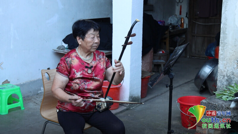 图为冯雪春奶奶为实践队队员演奏二胡。中国青年网通讯员杨宇迪 供图